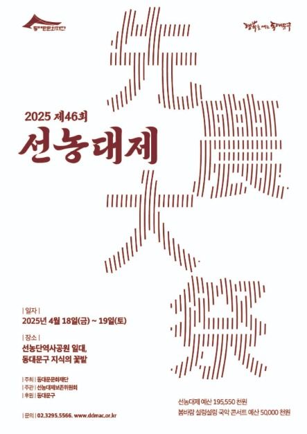 - 한 해의 풍년을 기원하며 농사의 신 신농에게 제사를 올리고, 임금이 직접 밭을 가는 친경이 이루어지던 '선농제'를 재현한 전통 행사이다. 46회를 맞이하는 선농대제는 전통을 계승하고 현대적으로 재해석하여 동대문구의 풍요를 함께 기원하는 행사이다.
