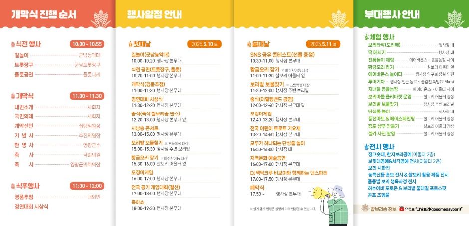 제11회 영광찰보리 축제는 ‘찾아보리, 먹어보리, 즐겨보리’라는 주제로 5. 10.(토)~5. 11.(일) 2일간 군남면 지내들 돌탑공원에서 개최한다. 올해 축제는 지역주민과 향우, 관광객이 함께 어울릴 수 있는 다채로운 체험 프로그램과 전국 경연대회로 허수아비 만들기 대회, 시 낭송 대회, 창작시 대회, 어린이 트로트 가요제, 영광찰보리축제배 공기 게임 대회 등을 개최하여 많은 가족 단위 방문객을 축제장으로 유치할 전략을 세우고 있다. 또한 관광객에게