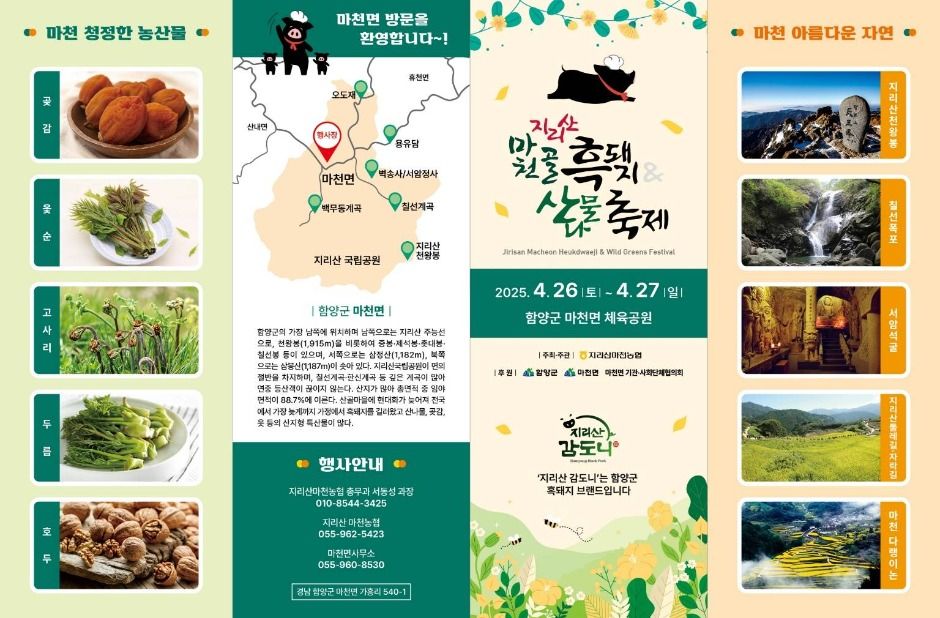 - 지리산 마천골 흑돼지&산나물 축제는 2015년 제1회 돼지감자&흑돼지축제를 시작으로, 2025년 제7회째를 맞이하고 있으며, 마천면의 특산물인 흑돼지와 산나물을 주제로 국립공원 제1호인 지리산이 소재하고 있는 마천면 생활체육공원에서 개최된다. 함양군 마천면은 청정 산골지역으로, 예로부터 옻순, 고사리, 두릅 등 산나물 및 벌꿀이 많이 생산되며, 이번 축제에는 마천 흑돼지와 산나물을 동시에 맛볼 수 있고, 각종 산나물의 조합인 대형비빔밥 퍼포먼스, 흑돼지