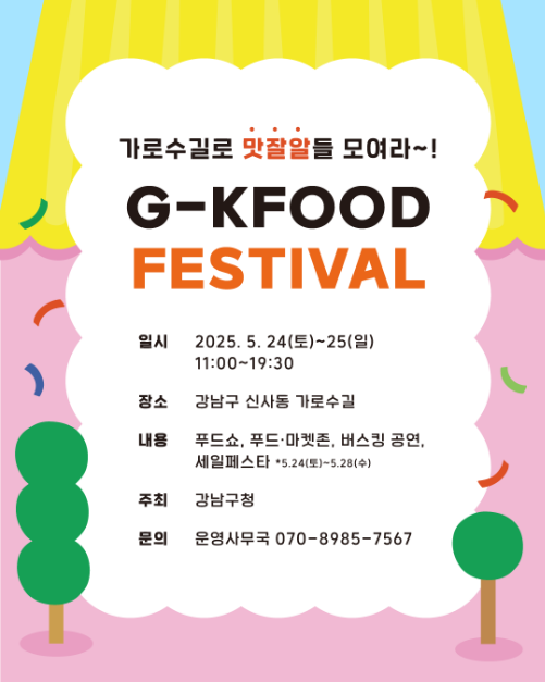 - 2025 강남 디자인위크 G-KFOOD FESTIVAL은 예술, 문화, 트렌드가 공존하며 '음식'을 매개로 일상 속 즐거움을 나누는 디자인위크 페스티벌 이다. 가로수길을 중심으로 펼쳐지는 이번 페스티벌은 스타셰프 푸드쇼 & 강연, 푸드 & 플리마켓, 버스킹 공연, 세일페스타 등 다채로운 프로그램을 통해 푸드 기반 라이프스타일 콘텐츠를 제공하며 가로수길이 지향하는 도시형 축제의 방향성을 제시한다.