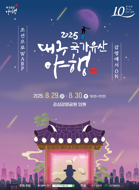 대구 국가유산 야행이 8월 29일(금)과 30일(토) 동안 경상감영공원과 향촌동, 포정동에서 개최된다. 조선시대 관찰사가 공무를 보던 선화당을 메인 무대로 하여 경상감영공원 곳곳에서 7가지 야간 테마를 담은 다채로운 체험과 공연을 즐길 수 있다. 가족, 친구, 연인 누구나 여름밤의 정취 속에 우리 국가유산의 아름다움을 감상하고, 야행을 맞아 야간개방하는 문화시설에 방문하여 즐거운 추억을 남길 좋은 시간이 될 것이다.