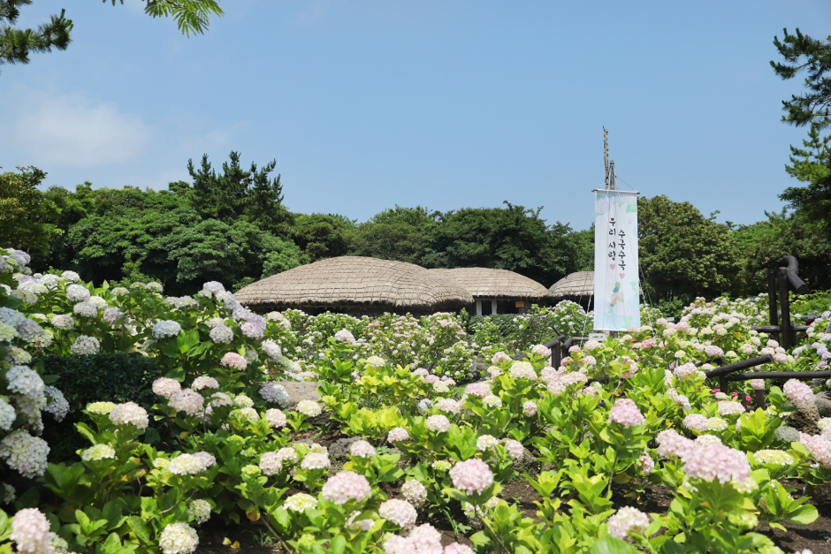 제주민속촌에서 6월 6일부터 7월 6일까지 개최되는 수국축제는 초여름 수국의 아름다움과 제주의 전통문화를 함께 즐길 수 있는 계절 기획형 축제이다. 축제 기간 동안 매주 토요일에는 전통 떡메치기 체험, 일요일에는 지름떡 만들기 체험이 무료로 운영되며, 주말마다 수공예품과 감성소품이 어우러진 플리마켓이 열린다. 관람객은 민속촌 곳곳에 배치된 스탬프를 찾아 완주하는 스탬프 투어에 참여할 수 있으며, 완주자에게는 소정의 기념품이 제공된다. 또한 제주민속촌 내