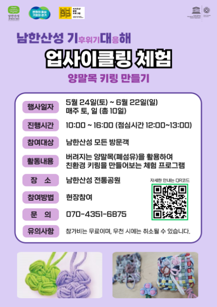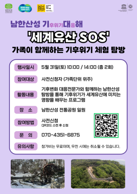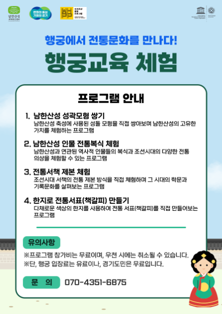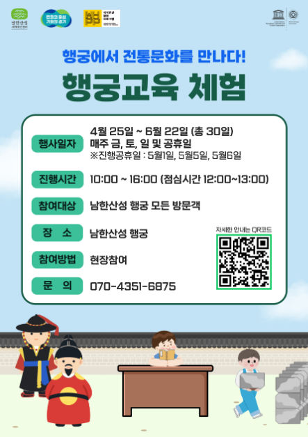 - 2025 세계유산 남한산성 활용프로그램은 남한산성 행궁에서 다양한 전통문화 체험을 통해 역사적 의미를 되새기고 교육적 가치를 높이는 상설 프로그램인 행궁교육체험, 참가자가 남한산성 성곽을 돌며 남한산성을 지키는 수어사가 되어보는 스토리텔링 체험 프로그램인 OUV 탐험대, 세계유산 남한산성을 기후위기로부터 보호하고, 보존의 중요성을 배우는 기후위기 대응 프로그램인 남한산성 기대해로 진행된다.