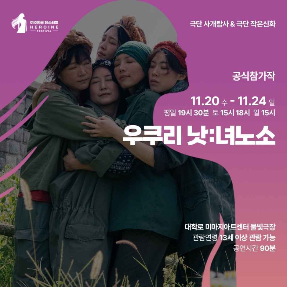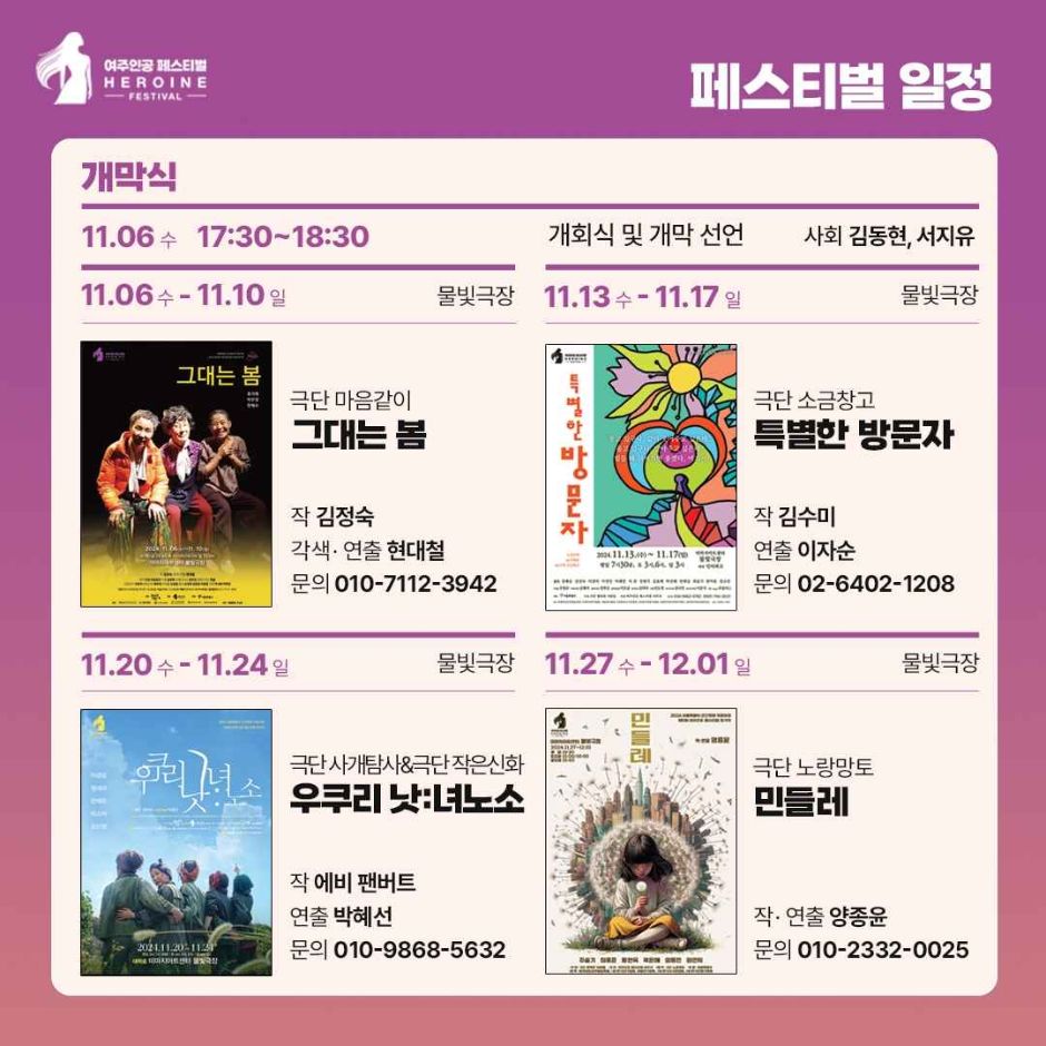 여주인공 페스티벌은 여성 중심의 서사를 가진 연극 작품을 발굴하고 공연하는 것을 목표로 하는 연극 축제이다. 이 페스티벌은 여성 배우들에게 다양한 캐릭터를 연기할 기회를 제공하며, 여성과 사회의 관계를 다루는 작품을 통해 문화예술의 서사 확장을 추구한다. 2024년 제5회 페스티벌은 11월 4일부터 12월 15일까지 대학로 물빛극장에서 열린다. 페스티벌은 총 5개의 연극 작품이 5주간 순차적으로 공연되며, 개막식과 폐막식에서 시상식이 함께 진행된다. 또한, 여성 인권을 주제로 한 강연과 모놀로그 토크쇼 등의 부대 프로그램도 포함된다??.
