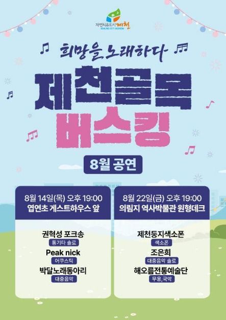 <2025 희망을 노래하다, 제천 골목버스킹>은 버스킹 공연을 통한 지역 상권 활성화와 지역 예술인의 활동 기회 확대를 목적으로 진행하는 행사이다. 2025년 6월부터 10월까지 약 5개월간 제천시 곳곳의 골목과 거리에서 다양한 장르의 거리 공연이 펼쳐질 예정이다. 이번 골목버스킹은 침체된 골목 상권에 활기를 불어넣고, 지역 예술인들에게는 시민과 직접 소통할 수 있는 열린 무대를 제공한다. 제천시 골목 상권에서 무료로 즐길 수 있는 공연을 통해 소상공인