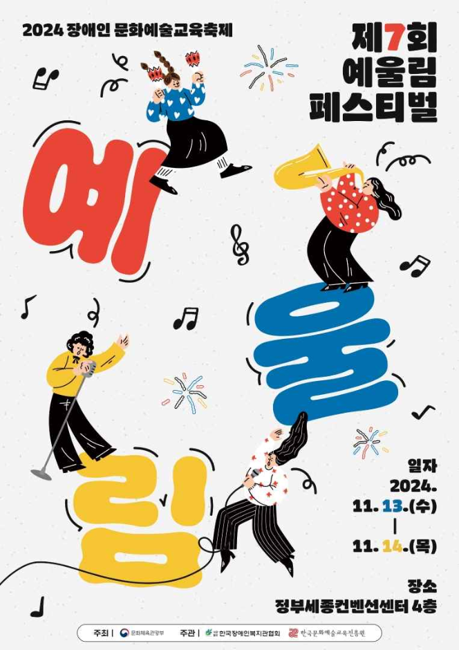 - [제7회 예울림 페스티벌]은 장애인분야 문화예술교육 프로그램 참여의 경험과 성과를 공유하는 과정을 통해 문화예술교육의 의미와 취지를 공감하고, 향후 문화예술교육 지원상버의 발전방안을 모색하는 기회의 장이다.