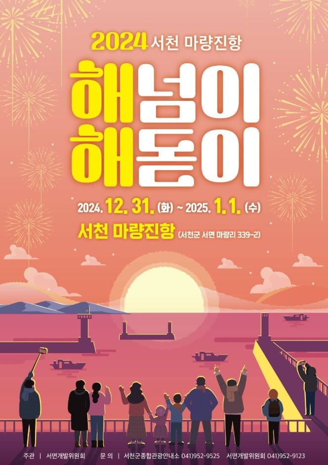 - 서면개발위원회는 12월 31일부터 1월 1일까지 서면 마량진항 일원에서 「서천 마량진항 해넘이·해돋이 행사」를 개최한다. 서해안에서 일몰과 일출을 한 곳에서 볼 수 있는 서천군 마량진항은 매년 한해의 마무리와 함께 새해의 소망을 기원하기 위해 많은 관광객들이 찾는 곳이다.