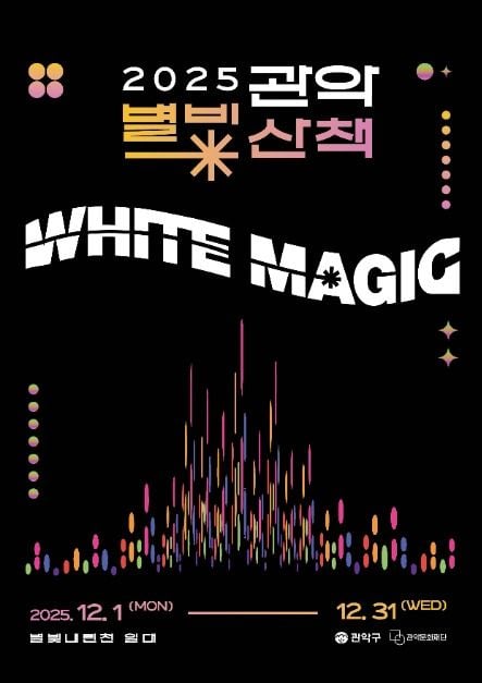 올해 5회째인 '관악별빛산책'은 관악구 대표 겨울축제로 별빛내린천(도림천)을 따라 조성된 산책형 빛예술을 경험할 수 있는 조명 축제다. 신림교에서 봉림교까지 300m 구간에서 '화이트 매직(White Magic)'을 주제로 진행되며, 국내 10팀의 아티스트가 만든 다채로운 빛 예술이 함께 어우러지는 공간을 연출해 인간의 이야기가 공동체가 되는 예술적 경험을 선사한다. 축제는 12월 1일 점등식으로 시작해 시민들과 함께 겨울의 첫 불빛을 밝히며, 축제 기간 중에도 다양한 체험 프로그램을 통해 볼거리와 놀거리를 제공할 예정이다.