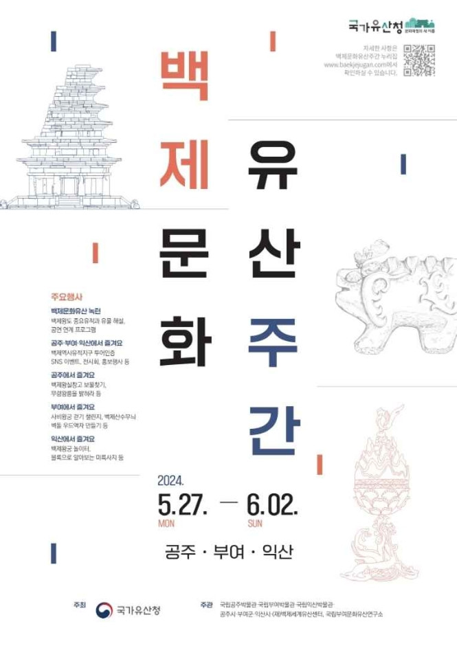공주?부여?익산에서 「백제문화유산주간」 개최한다. 「백제문화유산주간」은 백제역사유적지구의 문화적 가치를 극대화하고 다양한 문화 체험 제공 및 백제문화유산을 홍보하고자 백제왕도인 공주 ?부여 ?익산에서 8개의 문화유산을 대상으로 해마다 일주일 간 개최하는 문화유산 활용 프로그램이다. 본 행사는 국가유산청 역사문화권과, 국립부여문화유산연구소, 국립공주박물관, 국립부여박물관, 국립익산박물관, 공주시, 부여군, 익산시