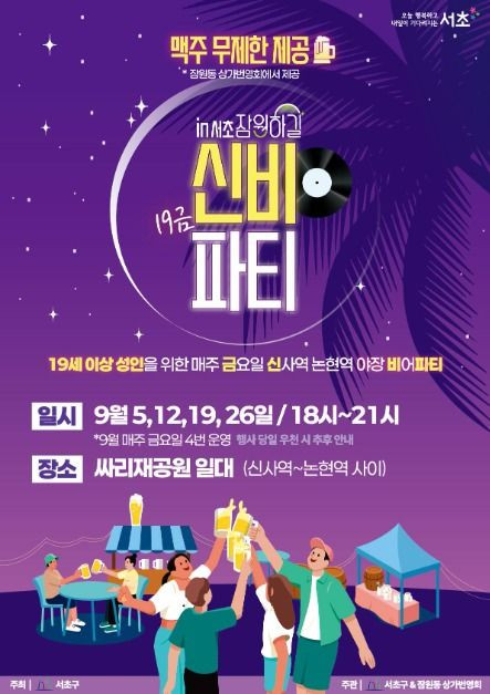19금 신비파티 in 서초는 서초구청 일자리경제과에서 잠원동 상권살리기 사업의 일환으로 진행된 축제이다. 9월 매주 금요일 신사역 및 싸리재공원 일대에서 저녁6~9시에 야장이 진행된다. 다른 맥주축제와 다르게 성인인증 및 상권에서 안주를 구매해오면 맥주를 무제한으로 제공해준다.