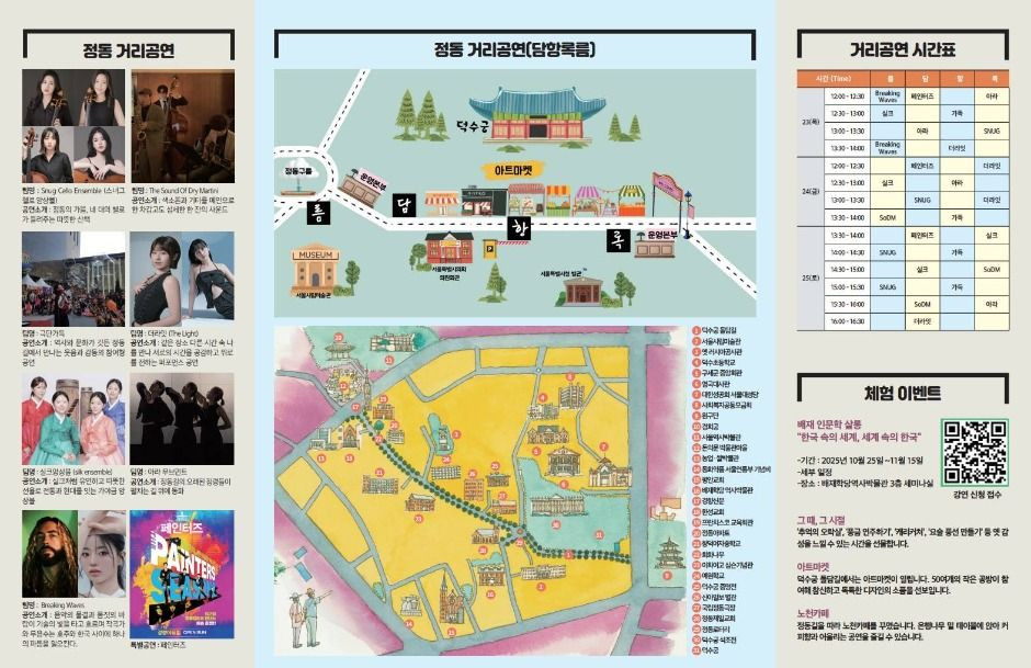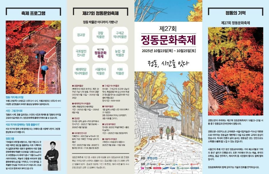 경향신문이 주최하는 제27회 정동문화축제가 10월23~25일 서울 중구 정동길과 온라인에서 열린다. 경향신문~프란치스코 교육회관~서울시립미술관~덕수궁 대한문으로 이어지는 정동길은 대한제국 시절 외교·문화 ·교육의 중심지였다. 역사와 전통이 살아 숨쉬는 정동길은 걷는 것만으로도 소확행(小確幸)을 느낄 수 있는 곳이다. 사흘간의 축제 기간 동안 정동로터리에는 거리 페스티벌과 ‘기억의 풍선’ 설치가 진행된다. 또한 거리에서 만나는 예술, 추억의 오락실, 풍금