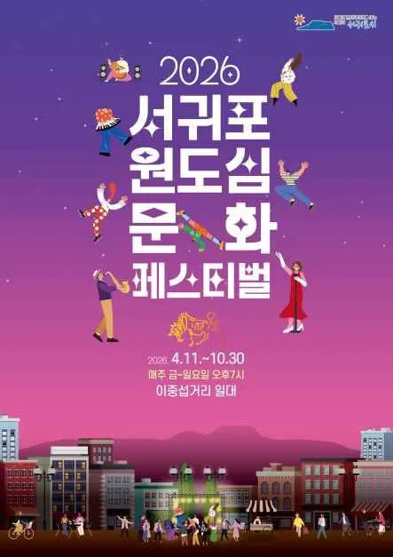 2026 서귀포 원도심 문화페스티벌’은 서귀포 이중섭로에서 펼쳐지는 야간 문화공연이다. 화려한 조명 아래 음악, 댄스, 퍼포먼스 등 다양한 장르의 공연이 관객들들에게 다양한 볼거리를 제공한다. 일상에서 벗어나 예술과 여유가 어우러진 특별한 추억을 남기고 싶은 이들에게 적극 추천하는 행사이다. ‘2026 서귀포 원도심 문화페스티벌’은 4월 11일부터 매주 금~일요일 저녁 7시에 운영되며, 10월 30일까지 이어진다. 서귀포 원도심의 감성적인 밤, ‘2026 서귀포 원도심 문화페스티벌’이 당신을 기다리고 있다.