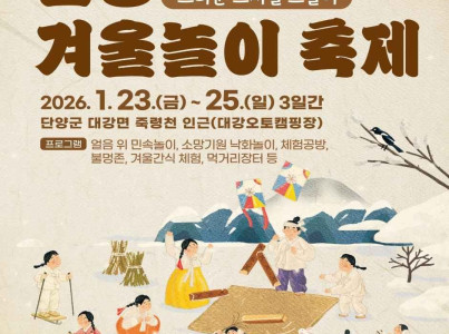 단양 겨울놀이 축제는 설경이 아름다운 단양에서 겨울의 즐거움과 그리운 전통놀이를 함께 즐길 수 있는 축제이다. 주요 프로그램으로는 얼음썰매와 외발썰매, 얼음판 줄다리기 등의 얼음놀이, 윷놀이, 쥐불놀이, 낙화놀이 등 민속놀이, 온 가족이 참여하는 체험마당과 추억을 남길 수 있는 불멍존, 포토마당이 운영된다. 또한 겨울간식 체험과 먹거리 장터, 지역 농특산품 판매장이 함께 열려 즐길거리와 볼거리, 먹거리를 모두 갖춘 겨울 축제의 매력을 전한다.