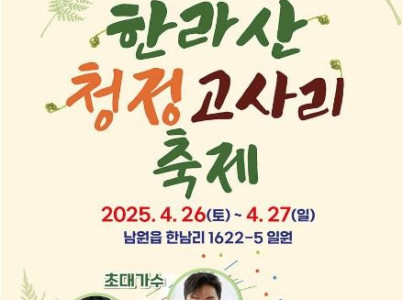 한라산 청정 고사리 축제'는 제주의 봄을 대표하는 체험형 축제로, 매년 4월 서귀포시 남원읍 한남리 일원에서 개최된다. 올해 2025년 4월 26일부터 27일까지 서귀포시 남원읍 한남리 일원에서 개최된다. 청정 자연 속에서 고사리를 직접 꺾고, 다양한 체험과 공연, 향토 음식까지 즐기며 제주의 자연과 문화를 오감으로 만끽할 수 있는 축제이다.