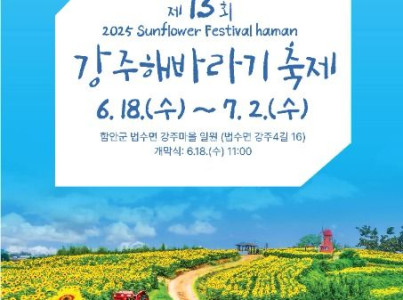 강주해바라기 축제는 2013년 1회를 시작으로 올해 13회를 맞는다. 18일 오전 11시 축제 시작을 알리는 개막행사를 시작으로 공연과 농특산물 판매, 먹거리마당 등이 다채롭게 펼쳐진다. 강주마을 일원에서 열리는 강주해바라기 축제는 식재면적 총 4만2,500㎡ 규모 내 해바라기와 백일홍, 이색 박터널이 방문객을 맞이한다. 성공적인 축제 개최를 위해 마을 주민들이 힘을 모아 비료살포, 비닐멀칭 등을 통해 해바라기가 잘 자랄 수 있도록 사전작업을 하였으며, 해바라기를 정성스럽게 파종하고 온 힘을 쏟아 재배관리를 하였다. '당신을 기다립니다'와 같은 해바라기의 꽃말과 같이 초여름의 파란 하늘 아래 태양 같이 활짝 핀 수십만 송이의 해바라기가 관람객들을 기다리고 있다.