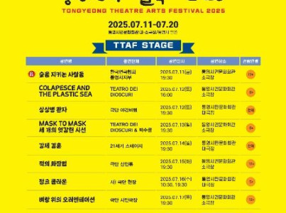 경남지역대표공연예술제 통영연극예술축제 7월 11일(금) 개막 10일간의 발견과 재발견 연극축제를 통해 새로운 연극 발견과 과거에 발견된 작품을 다시 창의적인 연극으로 재발견 된 작품의 콘텐츠를 다양하게 소개하고 사회적 환경에 철학적인 질문과 웃음 코드를 장착하여 대중에게 지속적으로 스며들어 우리 삶의 가치를 높이는 축제가 되고자 한다. 발견(경남, 통영, 글로컬)과 재발견(글로벌, 서양문학의 희곡작가)의 예술적 자산가치를 확장하고 소중한 연극자산 콘텐츠가 소멸되지 않게 개발, 육성, 보존이 존재하는 연극축제로 거듭나게하려고 한다.