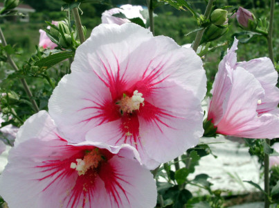 기본 정보 식물명 : 무궁화 '칠보' 학명 : Hibiscus syriacus 'Chilbo' 과명 : 아욱과 (Malvaceae) 자원구분 : 재배품종 분류체계 : 피자식물문 > 쌍자엽식물강 > 아욱목 > 아욱과 > 무궁화속