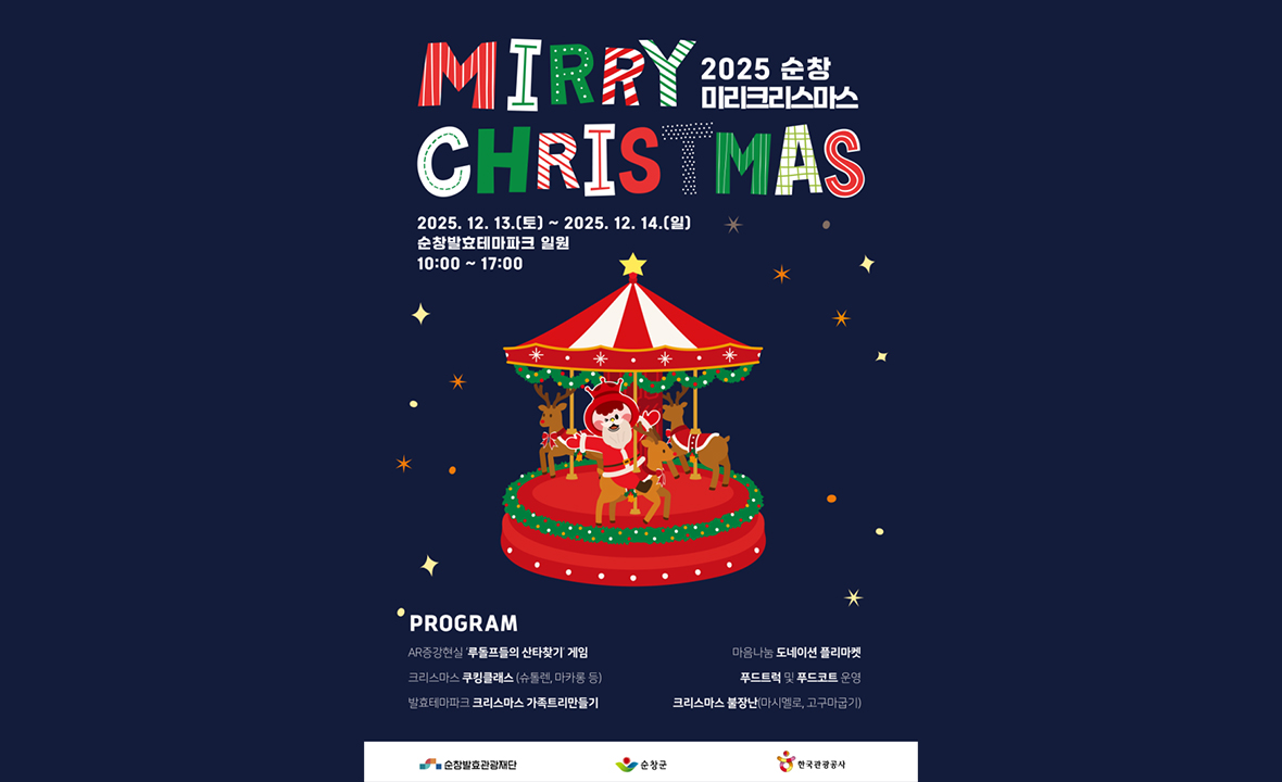 따뜻한 설렘이 가득한 겨울, 순창에서는 한발 먼저 크리스마스를 느낄 수 있는 **‘순창 미리 크리스마스 축제’**가 펼쳐집니다. 알록달록한 조명과 반짝이는 겨울 장식으로 꾸며진 축제장은 도착하는 순간부터 크리스마스 분위기에 흠뻑 빠져들게 합니다. 메인 거리에서는 대형 트리와 눈꽃 오브제가 어우러진 크리스마스 포토로드가 이어지고, 아이들을 위한 산타 마을에서는 산타 우체국, 루돌프 선물찾기, 쿠키 만들기 체험 등 가족 중심 프로그램이 다양하게 준비되어 있습니다. 해 질 무렵 시작되는 미니 캐럴 라이브 공연과 청년 예술가들의 버스킹은 겨울 감성을 한층 더하고, 밤이 되면 순창 강변을 따라 펼쳐지는 라이트 일루미네이션 쇼가 축제의 분위기를 절정으로 끌어올립니다. 또한 지역 농특산물과 겨울 간식을 맛볼 수 있는 따뜻한 푸드존도 마련되어, 크리스마스를 기다리는 설렘과 순창만의 푸근한 정취를 함께 즐길 수 있습니다. 차가운 겨울밤을 밝히는 빛과 음악, 그리고 미리 찾아온 크리스마스의 기쁨이 가득한 순창 미리 크리스마스 축제에서 한 해의 끝자락을 더 따뜻하게 채워보세요.
