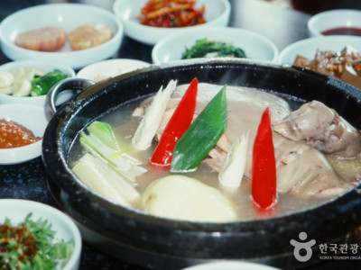 마늘과 생강, 파 등을 넣고 양념 없이 한소끔 끓인 고기를 건져 초장에 찍어먹는데 육질이 연하고 부드럽다. 고기를 다 먹고 나면 남은 국물에 다시 콩나물과 버섯 등 야채와 갖은 양념을 풀어 매운탕을 끓이고 밑반찬을 곁들여 밥을 먹도록 해준다. 따라나오는 반찬도 진안 명물인 더덕무침과 깻잎장아찌, 새우젓, 우엉나물, 느타리버섯무침 등 토속적인 것 일색이다.