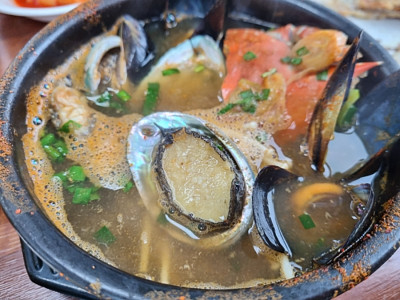 누이밥집은 제주 중산간서로 회수마을회관 근처에 자리 잡고 있는 제주 향토 음식 전문점으로, 제주 로컬의 맛을 느낄 수 있는 곳이다. 대표 메뉴는 전복과 전복 내장 소스를 곁들여 나오는 돌솥밥이다. 밥 위에 진한 전복 내장 소스가 더해져 감칠맛을 더하고, 부드러운 전복살이 입안을 풍성하게 채워준다. 뼈 없이 즐기기 좋은 갈치뚝배기와 전복 뚝배기 등도 인기 메뉴이다. 특히 접착뼈국은 돼지머리와 갈비 사이의 접착뼈를 고아낸 육수에 메밀가루와 무를 넣어 만든 제주만의 특별한 음식으로 이곳에서 맛볼 수 있다. 누이밥집은 아침부터 영업을 시작해 든든한 제주식 아침 식사를 원하는 여행객들에게도 안성맞춤이다. 매장 앞에는 넉넉한 주차 공간이 마련되어 있어 차량을 이용한 방문도 편리하다.