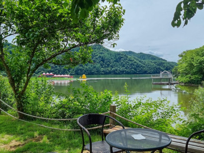 카페 아우라는 가평 청평호를 끼고 있는 카페로 수상레저, 호텔, 번지점프를 모두 할 수 있는 리버랜드에 있다. 테라스에서는 청평호에서 수상레저를 즐기는 사람들을 직관할 수 있다. 실내에는 널찍하게 테이블을 배치되어 있고 통창을 통해 청평호가 한눈에 들어온다. 메뉴는 일반 카페처럼 모든 커피 음료와 비커피 음료를 판매하며 음료와 어울리는 다양한 베이커리도 준비되어 있다. 반려동물은 야외 좌석에서만 동반이 가능하다.