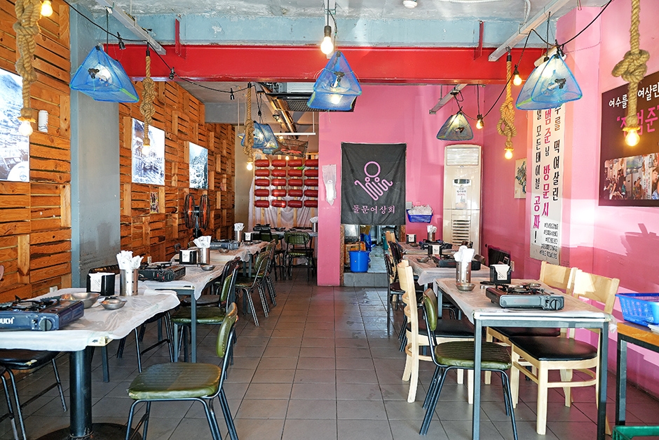 돌문어 상회는 돌문어삼합과 함께 전복물회, 라면 등 다양한 메뉴를 제공한다. 이곳의 대표 메뉴는 단연 돌문어 삼합이다. 돌판에 문어와 전복, 버섯, 단호박, 부추, 양파 등을 넣고 볶아 삼합처럼 즐기는 메뉴다. 먼저 삼겹살과 해산물, 갓김치를 구워 먹기 좋은 크기로 잘라 준 후 불판 가운데 버터를 넣고 모두 섞는다. 문어가 너무 빨갛게 익으면 질겨지니 먼저 먹는 방법을 추천한다. 다 먹었으면 고기와 야채를 조금 남긴 상태에서 밥을 볶아 먹으면 된다.