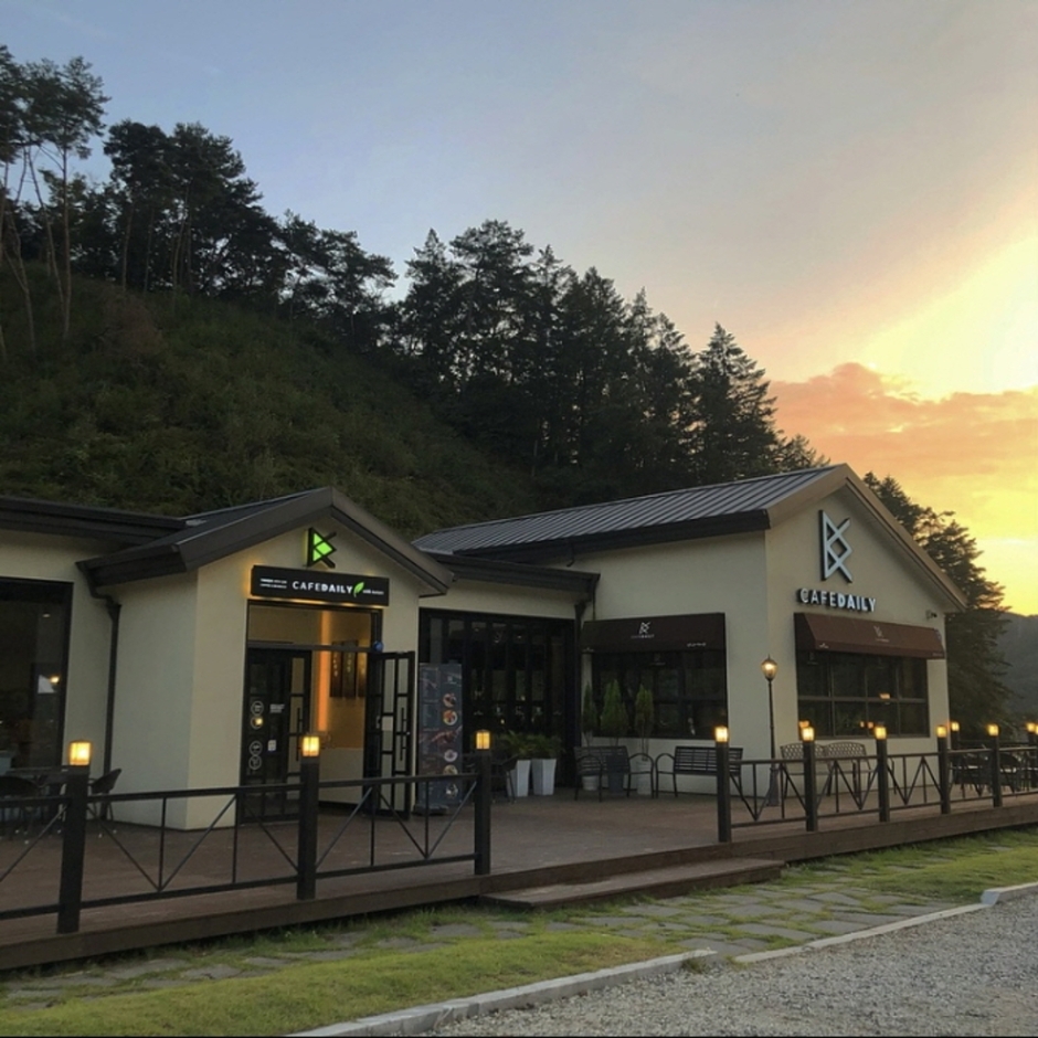 카페 데일리는 자연을 배경으로 하고 있어 계절의 바뀜에 따라 시시각각 달라지는 자연의 풍경을 보고 느낄 수 있다. 야외 데크 및 잔디밭 테이블에서 여유롭게 휴식이 가능하고 실내 또한 많은 식물들이 있어 푸르른 분위기를 조성한다. 휴식하기 편한 좌석과 단체석, 넓은 주차장이 있다. 시그니처 음료와 직접 담근 수제청 차를 맛볼 수 있으며 그 외에도 다양한 음료와 디저트가 준비되어 있다. 또한 편의점 코너가 있어 가볍게 드시고 싶으신 분들께서 이용 가능하다.