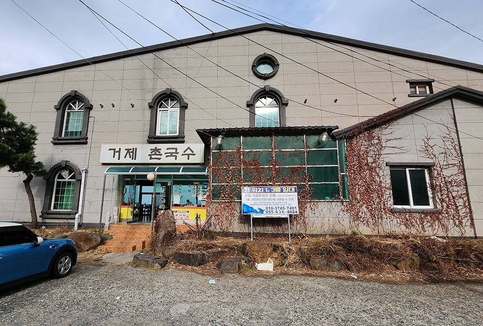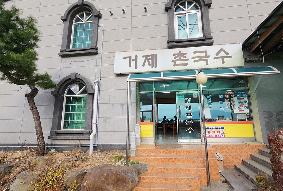 거제에서 통영 가는 방향 사등에서 가조도 가는 길목 대로변에 있는 거제촌국수은 바다가 보이는 오션뷰 국수집이다. 메인 메뉴인 촌국수는 따뜻한 것과 차가운 것이 있는데 잔치국수와 우동 국물의 중간 맛이다. 계란지단과 어묵을 채 썰어 듬뿍 올린 고명은 쫄깃한 국수와 같이 먹는 맛이 일품이다. 언제 먹어도 질리지 않는 국수 요리를 다양한 메뉴로 맛볼 수 있다. 실내에 넓은 테이블들이 많지만 점심시간마다 만석이라 조금 늦게 오면 평일에도 대기를 해야 한다. 가게 앞 대로변에 주차를 할 수 있는 공간이 있으며 계도어촌체험마을과 노을이 물드는 언덕 등이 인접해 있어 함께 둘러보기 좋다.