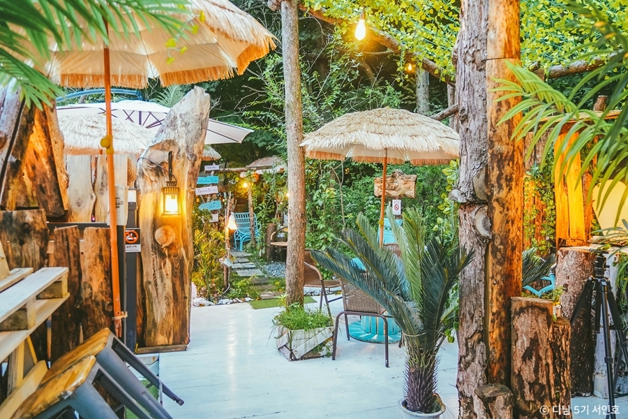 카페 인테리어는 마치 동남아 휴양지를 연상케 한다. 야자수 나무와 파라솔 등과 아기자기한 소품들로 꾸며져 있다. 시즌에 따라 바뀌는 소품도 색다른 볼거리다.