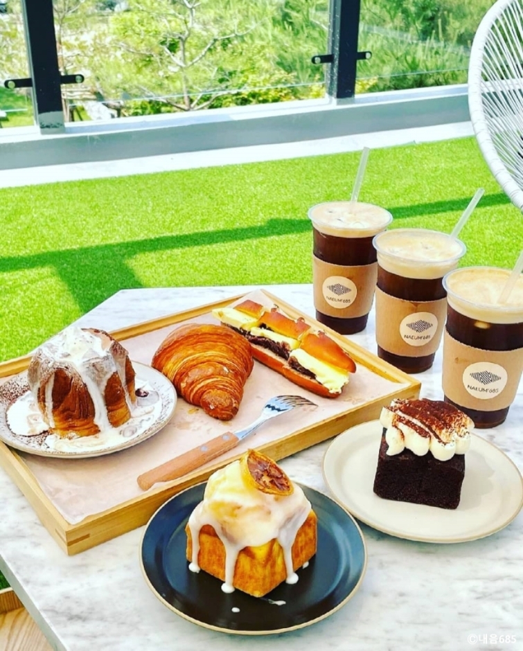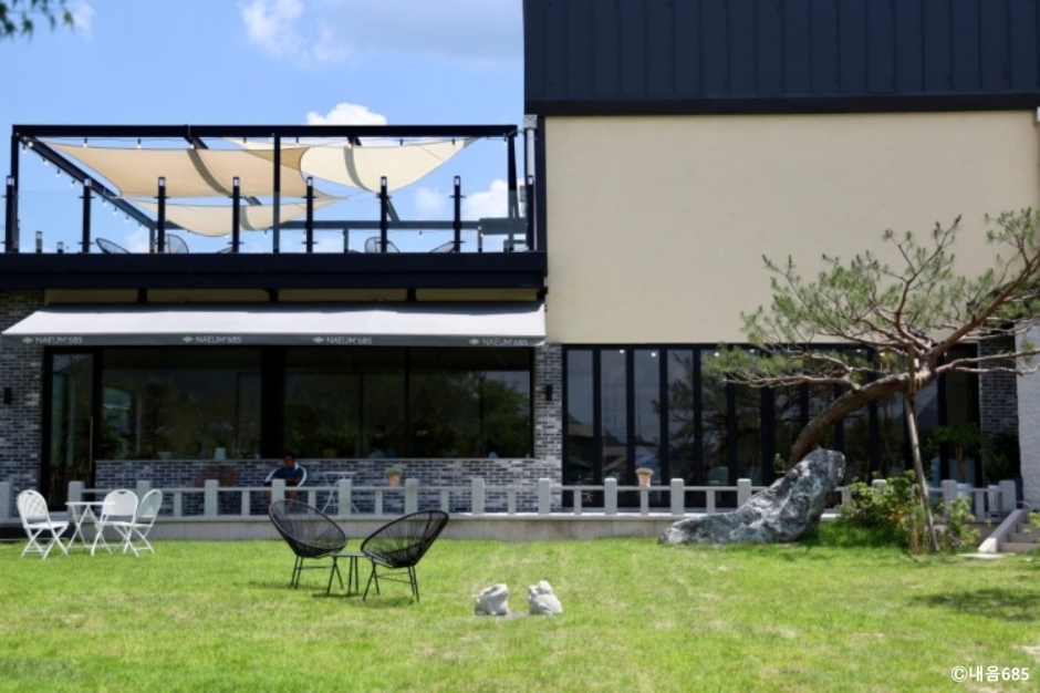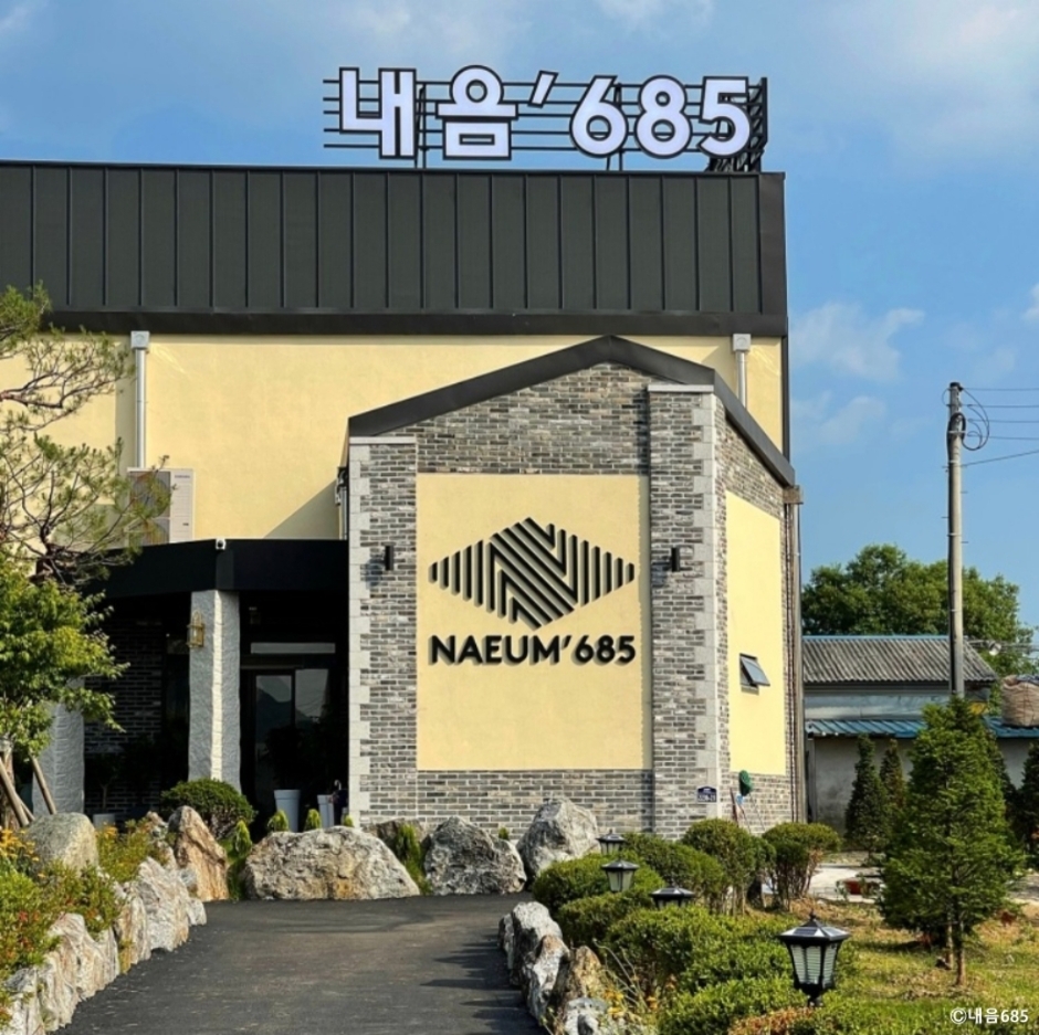 내음685는 포천시 내촌면에 있는 대형 베이커리 카페이다. 지번 주소가 음현리 685여서 이름이 내음 685이다. 주도로에서 조금 안쪽으로 들어와 있어 내비게이션을 잘 보고 찾아가야 한다. 제대로 찾아가면 넓은 전용 주차장이 나온다. 푸른 잔디밭과 넓은 정원, 루프탑을 모두 갖추었다. 천연 화이트 대리석을 사용한 인테리어에 층고는 높고 까만 창틀을 통해 보이는 초록 뷰가 멋지다. 실내에도 화분을 많이 배치해 화이트, 그린, 블랙의 조화가 세련된 느낌을 준다. 테이블 사이를 흰 커튼으로 장식해 공간 분리도 되고, 소음도 줄이면서 프라이빗한 공간을 만들었다. 개업 때부터 모든 빵은 당일 생산 당일 판매 원칙을 지키고 있다. 낮에는 초록의 뷰가 좋고 밤에는 잘 꾸민 정원에서 보는 야경이 좋은 카페이다. 베어스타운에서 5분 거리에 있어 가족 나들이 후 방문하기 좋고 데이트 코스로 가기도 좋다.
