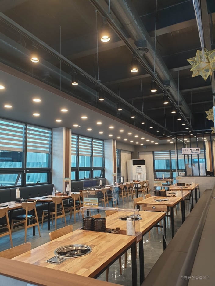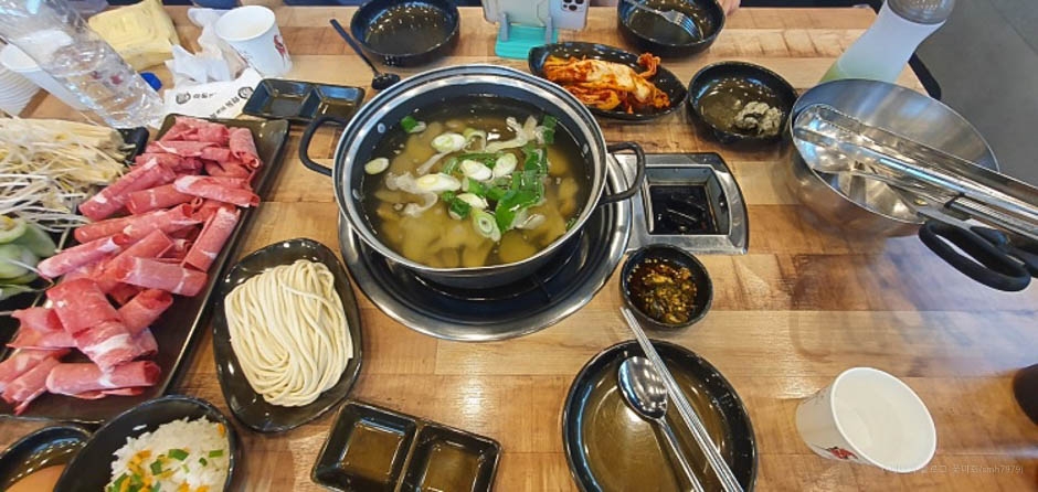 안동전골 칼국수는 넓은 매장에 신선한 재료가 준비되어 있다. 소고기 샤부샤부를 주문하면 먼저 바지락과 수제비가 들어 있는 기본 육수가 제공되고 고기(1인 150g)와 숙주나물, 버섯 종류, 청경채가 차려진다. 모든 재료가 신선하다. 육수가 보글보글 끓기 시작하면 야채를 넣어 주고 버섯, 소고기, 기타 재료들을 익혀 먹으면 된다. 셀프 바가 있어서 자유롭게 가져다 먹을 수 있다.