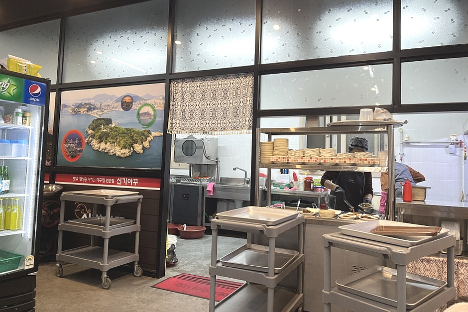 여수 현지인들이 즐겨 찾는 아귀찜 전문점 신기아꾸는 4인 테이블, 8인 테이블 그리고 안쪽 벽 쪽 자리도 있어 여럿이 함께 와도 식사하기 편한 곳이다. 아귀는 남해안에서 많이 잡히는데 현지인들의 억양이 세서 아꾸라고 부르기 때문에 '신기아꾸'가 되었다고 한다. 신기동에서 30년 넘은 아주 오래된 식당으로 최근에는 입식으로 앉아서 먹을 수 있게 인테리어 공사를 해서 신발을 벗지 않고도 그대로 편하게 앉아서 먹을 수 있다. 깔끔하고 깨끗한 실내에 메뉴는 아귀찜, 아귀탕, 서대회, 대창 찜으로 단출하다. 밑반찬으로는 노각무침, 고사리, 멸치볶음, 계란찜 등이 나온다. 주차장은 따로 없어 근처 골목이나 뒤쪽 주택가에 주차해야 한다. 단, 도로변은 주차단속 구역이니 주의해야 한다. 주변에 신기공원, 시모공원 등이 있어 연계 관광하기 수월하다.