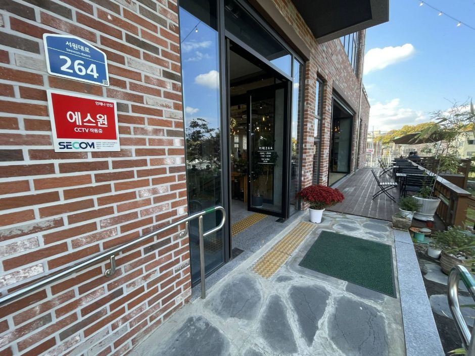 원주시의 새로운 랜드마크로 자리매김하고 있는 카페 264는 넓고 쾌적한 공간과 다양한 메뉴로 많은 사랑을 받고 있다. 특히, 애견 동반이 가능한 테라스 좌석이 마련되어 있어 반려동물과 함께 여유로운 시간을 보내기에 좋다. 그 외에도 넓은 테이블과 콘센트가 마련되어 있어 노트북 작업이나 스터디를 하기에 좋다.