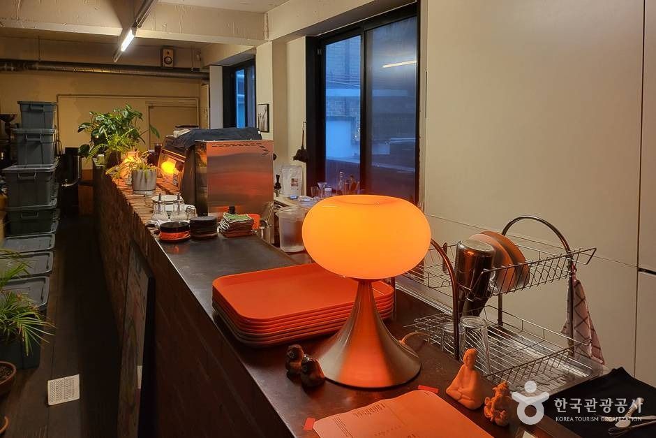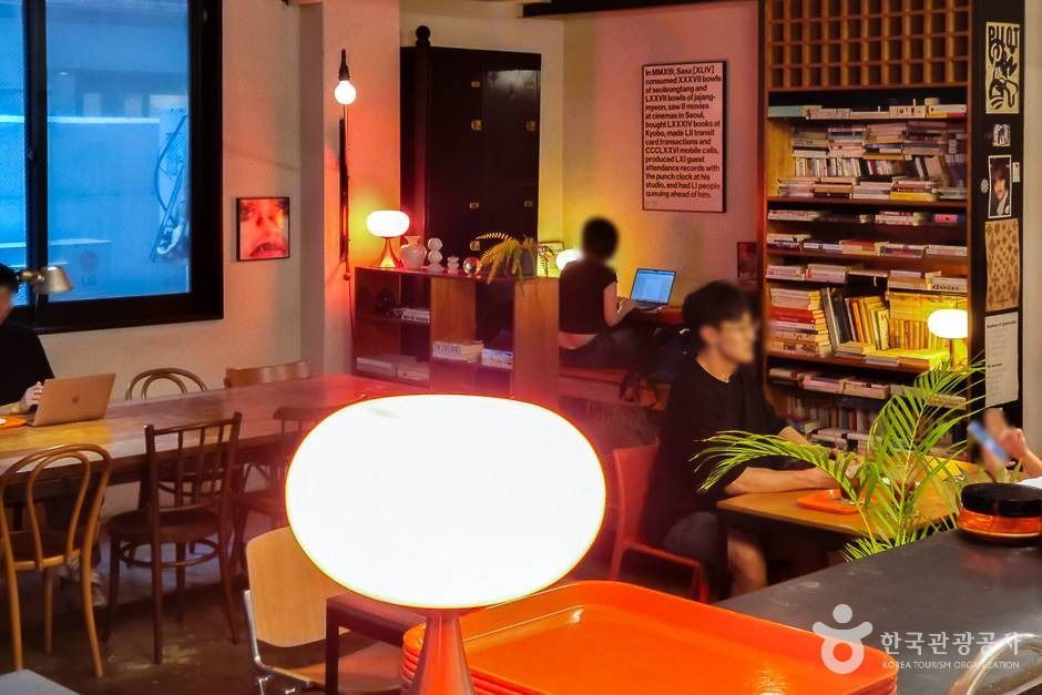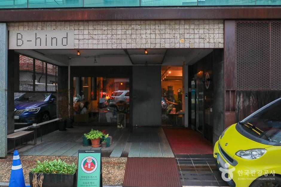 카페 B - hind는 대로 한복판이 아닌 대로 뒤편의 한적한 공간이라는 의미를 담고 있다. 뒷이야기가 많은 공간. 모두가 이 공간을 좋아하고 공간에 대해 대화하기를 바라는 마음을 담고 있다. 또,'B-'가 주는 아날로그적인 느낌의 공간 이미지와 컨셉을 담고 있다. 통유리창, 대형 칠판으로 꾸며진 벽, 아담한 외관과 같은 근사한 인테리어와 음악이 너무나 잘 어울이는 곳이다. 이달의 샌드위치를 정해서 내놓기도 하는데, 샌드위치의 맛 또한 훌륭하다. 와인의 초보자도 부담없이 즐길 수 있는, 달콤한 와인이 모여 있는 곳이기도 하다. 홍대 대학가에 위치해서인지 문화를 즐기고, 좋아하는 물품들을 사고 팔 수 있는 프리마켓도 열고 종종 전시회도 연다.