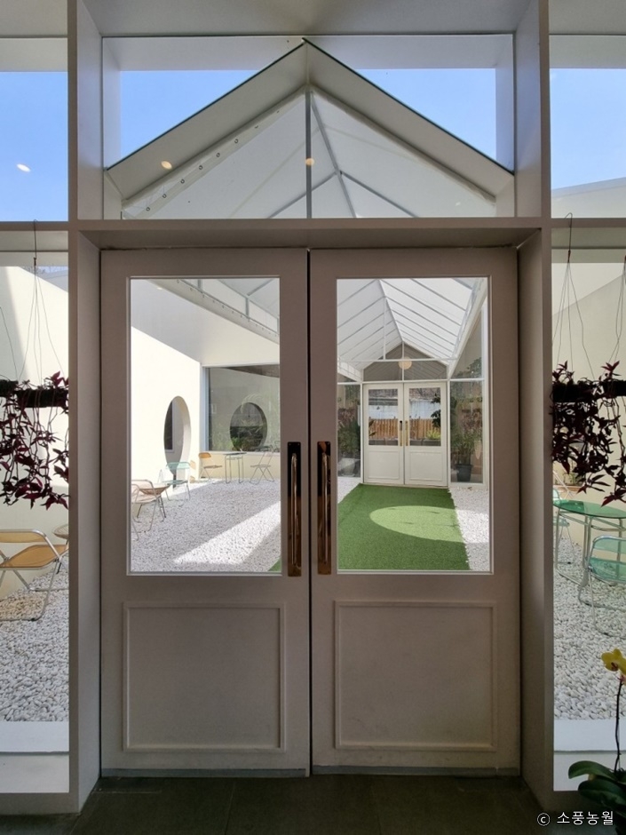 경기도 파주시 방촌로에 있는 베이커리 카페다. 높은 천장과 통유리 덕분에 실내가 훨씬 쾌적해 보인다. 2개의 건물로 나뉘어 있고, 그 사이에 야외 테라스를 꾸몄다. 건물 밖으로 나있는 돌계단을 오르면 넓은 잔디밭과 나무 테이블이 있어 아이들이 뛰어놀기 좋다. 실내 및 실외 좌석 모두 이용 가능하다. 실내 좌석 옆으로 다양한 식물들을 배치해 놓아 초록의 싱그러움을 느낄 수 있으며, 감성적인 분위기를 배경으로 사진 찍기에도 좋다.