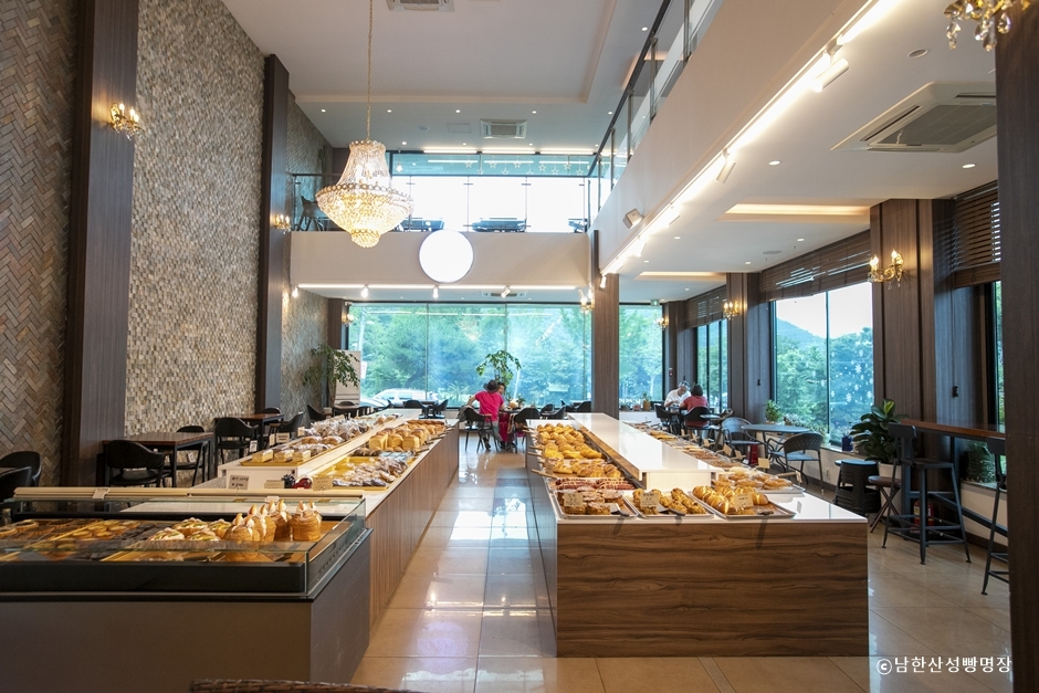 남한산성빵명장은 경기도 광주시 남한산성에 위치한 대형 베이커리카페이다. 내부는 통유리창으로 되어 있어 개방감이 좋고, 2층과 루프탑에도 좌석이 마련되어 있다. 남한산성빵명장은 특허받은 천연 발효종과 100% 유기농 밀가루, 건강하고 좋은 국내산 재료들만을 고집하여 빵을 만든다. 생유산균이 살아있어 빵을 먹고 나서도 속이 편하다. 약 100여 종의 다양한 빵과 사계절 언제나 아름다운 남한산성의 풍경을 만날 수 있는 베이커리이며, 단체석과 잔디가 있는 루프탑도 함께 이용할 수 있다. 남한산성의 자연경관을 배경으로 커피 한잔과 함께 힐링을 하고 싶다면 이곳을 추천한다.