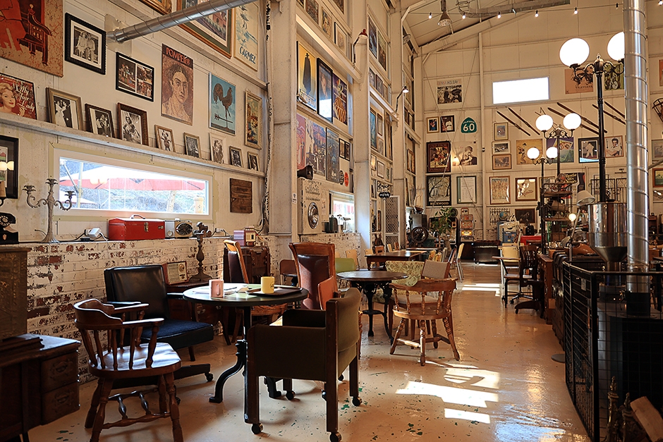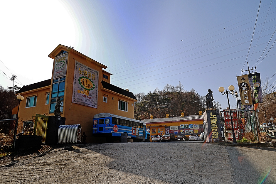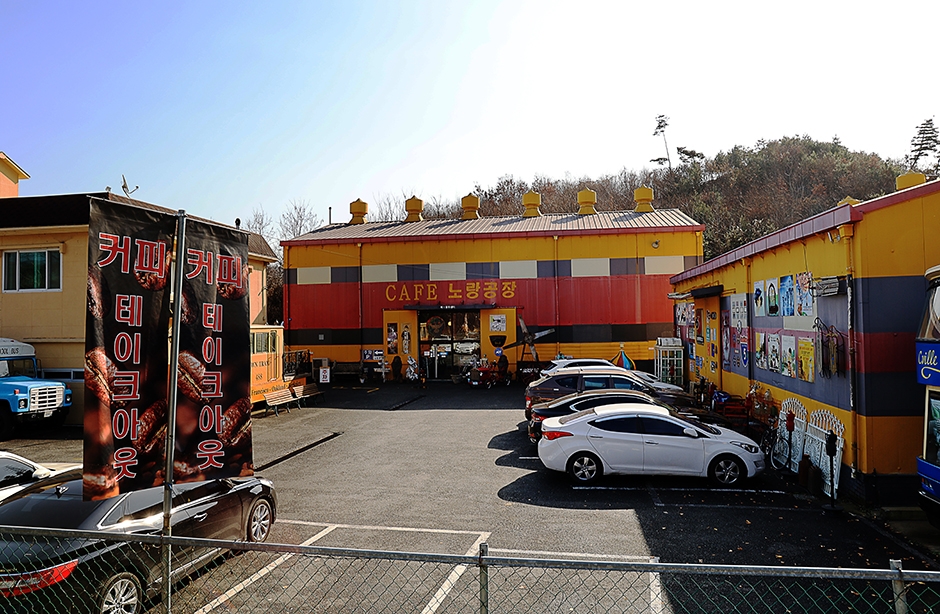 노랑공장은 횡성읍에서 횡성 댐으로 가는 길에 있다. 수입 물류창고를 카페로 개조한 곳으로 매우 독특하고 볼거리가 많다. 영국 이층버스와 미국 스쿨버스, 앤틱 트림과 마차가 서 있는 외부도 이색적이지만, 노란색으로 칠해진 오래된 공장문을 들어서면 앤틱샵이나 골동품박물관을 연상케 한다. 앤틱 전시 물품 사이사이 테이블이 있는데, 그 자체가 포토존 역할을 한다. 건물 뒤에는 산과 연결된 유럽풍의 야외 분수 정원도 있다.