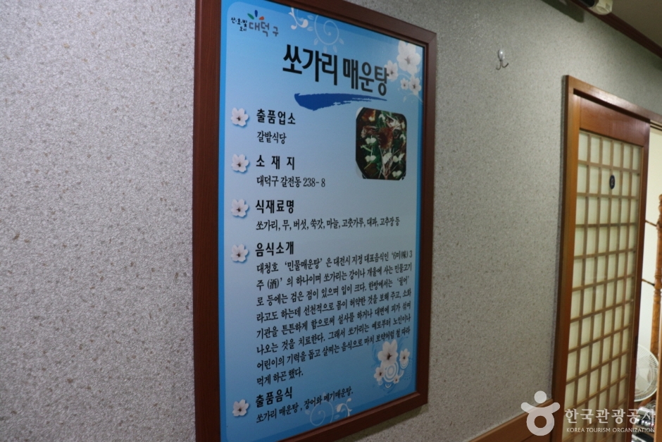 금강에서 잡히는 쏘가리는 조선시대 임금에게 진상되던 대전의 특산물로 유명하며, 금강 중류인 신탄진 지역은 예로부터 민물고기 요리가 발달되어 왔다. 81년 대청댐 준공 후 주변에 민물 매운탕 요리집이 들어서면서 그 맛을 인정받고 있다. 그 중 대청호수변에 위치한 갈밭식당은 민물고기 요리 전문점이다. 쏘가리 외에 장어, 송어, 메기, 빠가사리 활용한 매운탕과 회를 취급한다. 매운탕은 민물고기의 비린내를 잡기위해 직접 만든 비법양념과 다양한 야채를 넣어 끓여낸다. 대전 도심에서 잠시 벗어나 대청호와 주변 경관을 보고 휴식을 즐기며 식사를 할 수 있다.