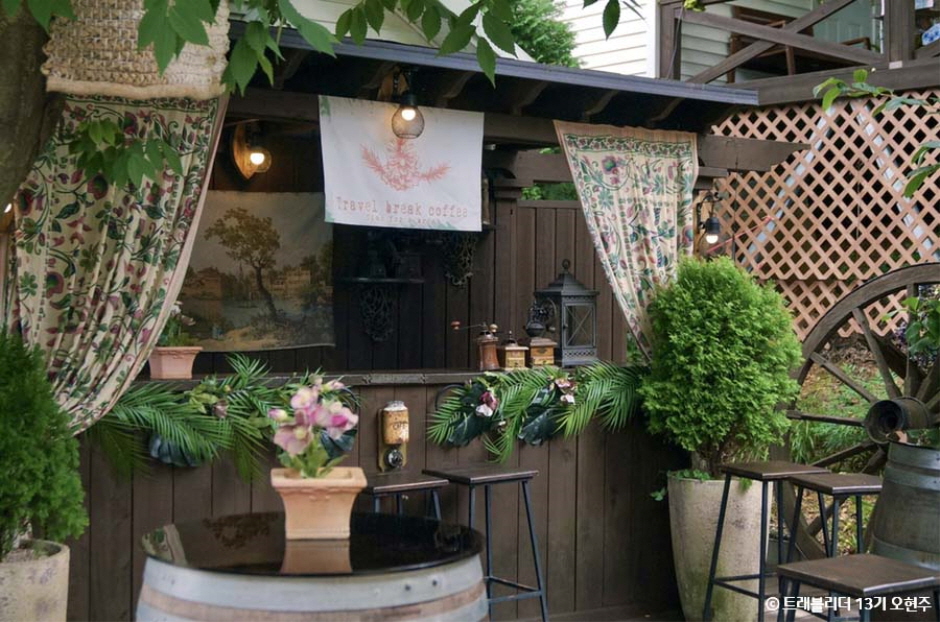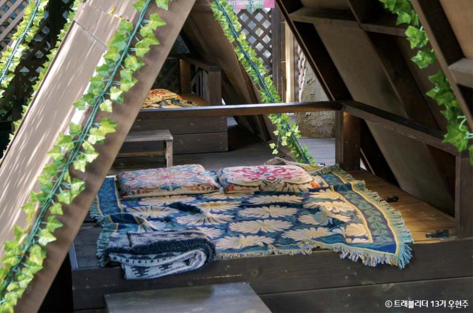 몽산포해수욕장에서 10분 거리의 안면도 작은 섬마을에 있는 카페다. 마치 동남아 휴양지에 와있는 듯 나무와 연못으로 꾸며진 정원 같은 테라스와 아기자기하게 꾸며진 실내공간에서 예쁜 사진을 찍어갈 수 있다. 특히 테라스에 있는 베드 존이 인기가 많아 1시간 이내만 사용하도록 안내하고 있다. 커피와 음료 외에 로스트비프 피자, 리코타 바질페스토 피자, 케이준 프라이드 등의 식사 메뉴와 팥빙수 같은 디저트 메뉴도 판매한다.