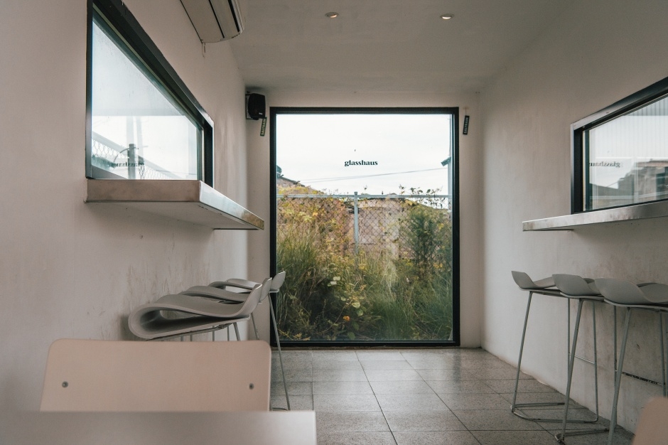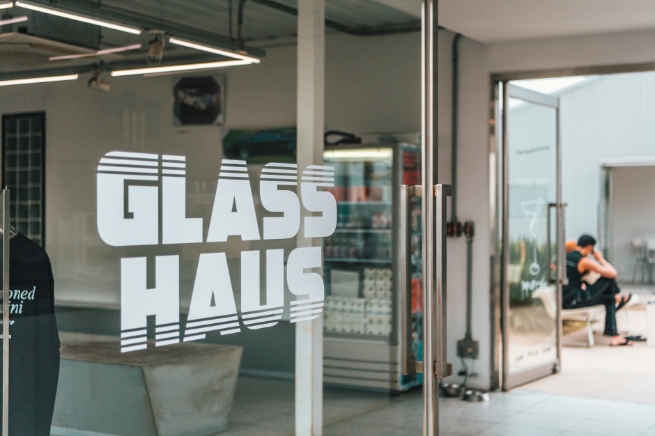 강원도 고성 천진해수욕장 바로 앞에 위치한 서핑 포인트에 있는 카페이다. 2016년에 문을 열었다. 서퍼들이 큰 파도(barrel) 속을 뚫고 나오며 그 속이 유리집 같다고 하여 사용하는 서핑 용어 ‘glass house’에서 카페 이름을 따 붙였다. 매장에는 따로 주차 공간이 마련되어 있진 않지만, 매장 부근 해수욕장 주차장을 이용할 수 있다. 커피와 차, 음료, 맥주 등을 판매하고 있다. 룩북이나 TV 광고 촬영 등을 위해 카페와 야외를 대관하며, 사전 예약이 필요하다. 패션 관련 일을 하던 카페 대표가 여러 여행지에서 모은 다양한 감각적인 소품들을 볼 수 있는 쇼룸 공간도 있다.