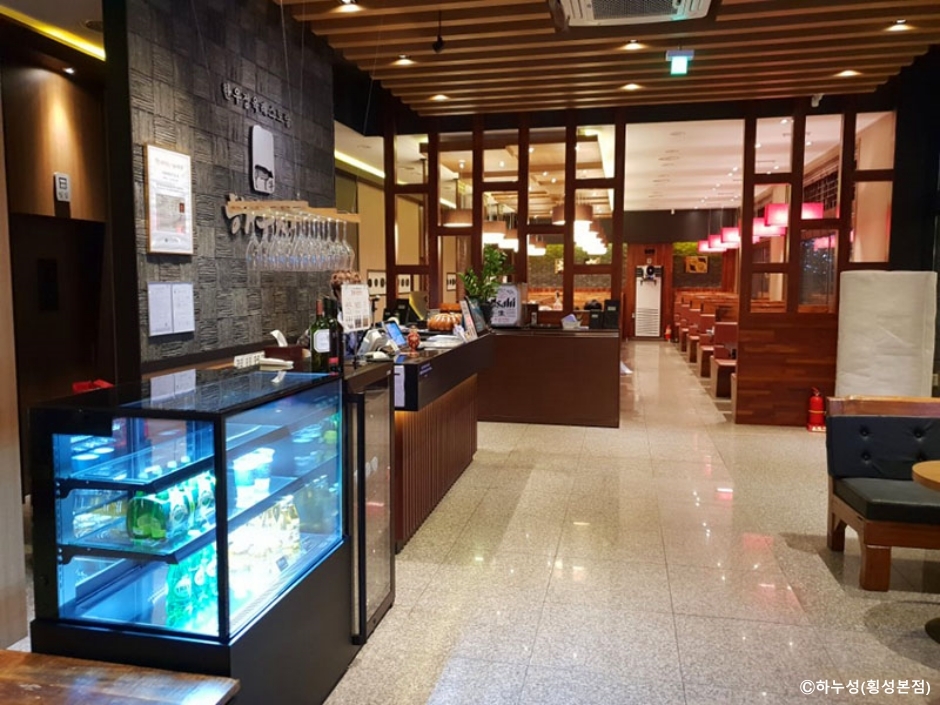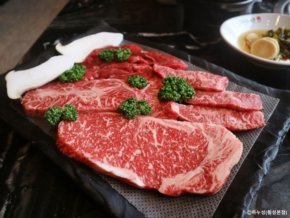 하누성 횡성본점은 강원도 횡성군 둔내면에 있는 한우전문점이다. 쇼케이스에 한우를 부위별로 포장해 놓은 것을 보고 골라서 구워 먹을 수 있는 식당이다. 이곳은 한우 투플러스만 취급하는 식당으로 고기의 품질이 매우 좋다. 주변에 둔내스키장도 있고 오크밸리, 웰리힐리 리조트도 있어 가족 동반 손님이나 라운딩을 나온 골퍼들이 많이 방문한다. 고기를 고르고 자리를 잡으면 맛있는 밑반찬과 숯불을 가져온다. 적당한 기름에 육즙이 배어 나오는 고기의 맛이 뛰어나다. 매장에서 먹은 고기는 쇼케이스에서 골라 포장해 갈 수도 있다. 주차는 매장 앞에 전용 주차장이 있어 이용이 편리하다.