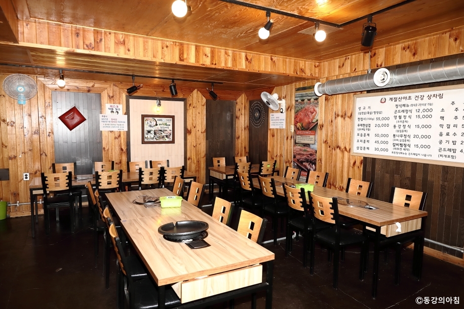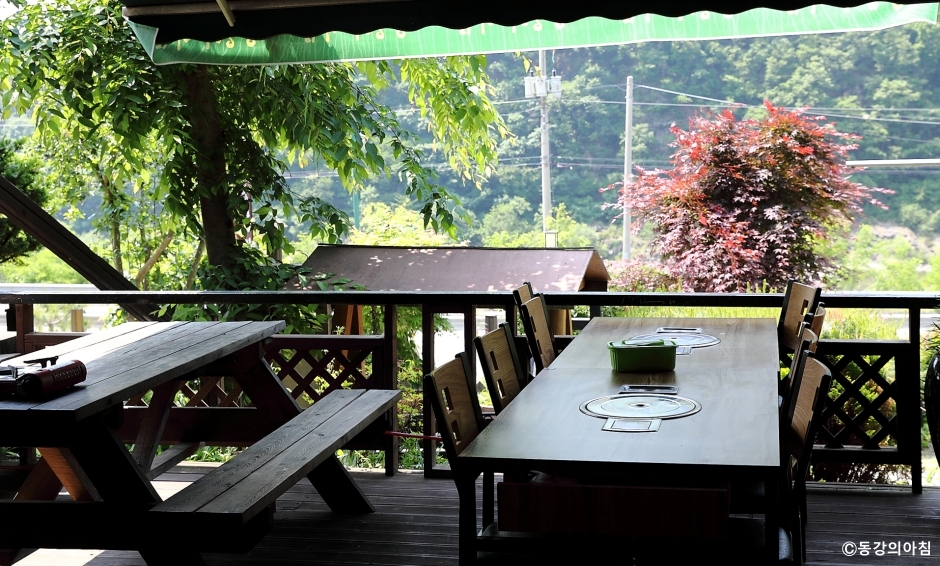동강의아침은 강원도 영월군에 있는 자연밥상 식당이다. 동강가에 자리 잡고 봉래산을 마주하고 있다. 동강시스타CC 근처여서 라운딩을 나온 골퍼나 동강 래프팅을 나온 여행객들, 현지인 모두 좋아하는 식당이다. 곤드레밥에 오리 훈제 생고기를 같이 먹는 한 상 차림이 인기 메뉴이다. 고기는 장작불에 초벌을 한 후 식탁에서 구워 먹는다. 강원도 산채와 건나물을 이용한 다양한 반찬들이 입맛을 돋운다. 집된장으로 끓이는 된장찌개도 손꼽히는 음식이다. 압력솥에 해서 부드럽고 찰진 곤드레밥에 양념간장을 넣어 비벼 먹으면 더 맛있다. 요즘 흔히 볼 수 없는 목조 건물로 외관이 상당히 멋스럽다. 식사는 내부를 이용할 수도 있고, 테라스에서 할 수도 있다. 주차는 외부에 넓은 전용 주차장이 있어 이용이 편리하다.