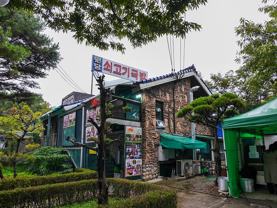 원당쇠고기국밥은 서오릉에서 원당 방면으로 넘어가는 길에 있는 국밥 전문점이다. 가정집을 개조한 건물로 매장 앞과 뒤쪽에 주차 공간이 넉넉하게 있고 안내해주는 직원이 있어 편하게 주차할 수 있다. 신발을 벗고 들어가면 가정집 구조로 된 내부에는 테이블이 곳곳에 있어 다양한 인원을 수용할 수 있다. 한 번 끓였다가 냉장고에서 48시간 숙성하는 국밥은 걸쭉하고 칼칼한 국물로 해장국 맛집으로 유명하다. 식사 시간에는 늘 대기가 있지만, 음식이 빨리 나와 회전율이 높은 편이다. 전 메뉴 포장할 수 있고, 택배비를 별도 부담할 경우 택배도 된다.