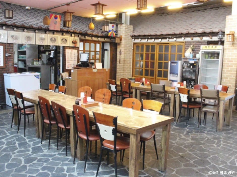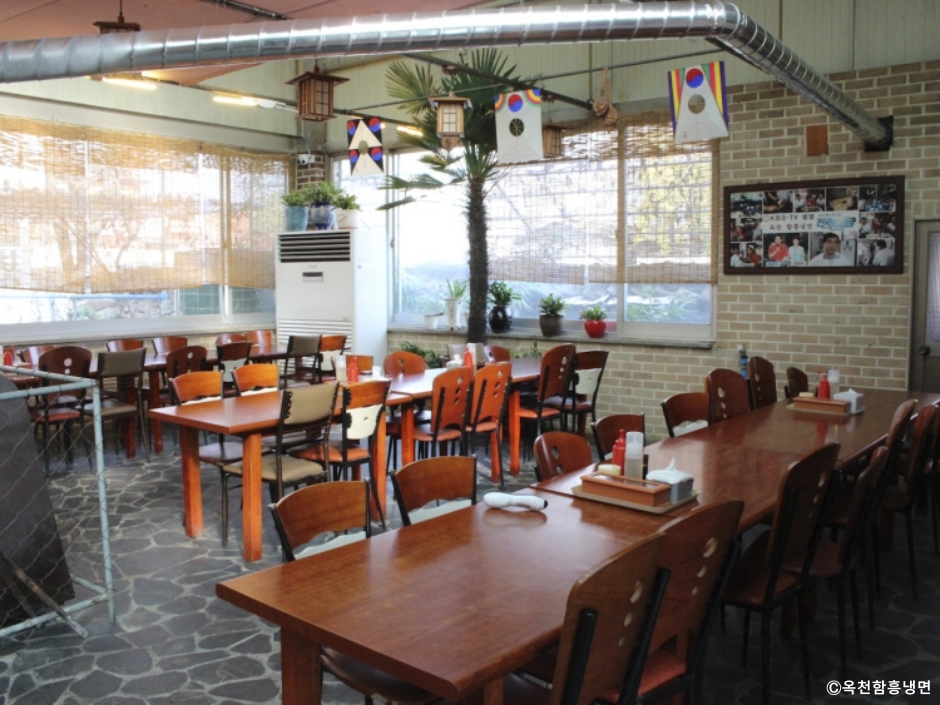 경기도 양평 옥천에 있는 옥천함흥냉면은 한옥을 개조한 건물로 소박한 가정집의 모습을 지니고 있지만 규모가 있는 대형 식당이다. 자리에 앉으면 주문도 하기 전에 육수 주전자를 가져다준다. 냉면의 밑반찬은 무절임이 전부이다. 냉면과 함께 수육과 완자도 맛볼 수 있다. 두 가지를 모두 먹고 싶다면 반반 메뉴를 주문하면 된다. 회냉면은 가자미회를 무친 것으로 오돌오돌하고 쫄깃한 맛이 일품이다. 회를 더 먹고 싶다면 회무침을 곁들임 메뉴로 주문할 수도 있다. 내부엔 방도 있고, 입식 테이블 좌석도 있어 편한 곳을 선택하면 된다. 대형주차장이 앞뒤로 있어 편하게 주차할 수 있다.