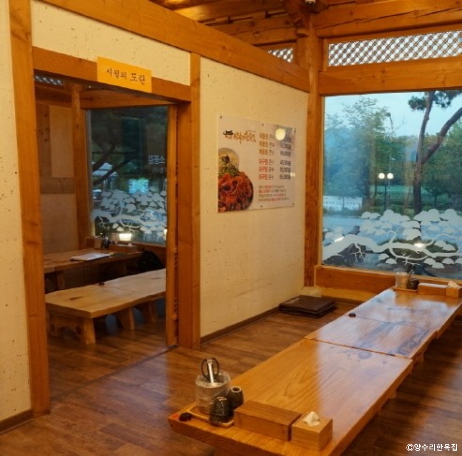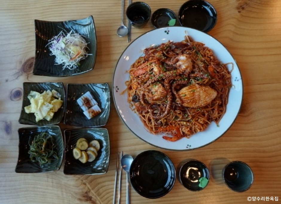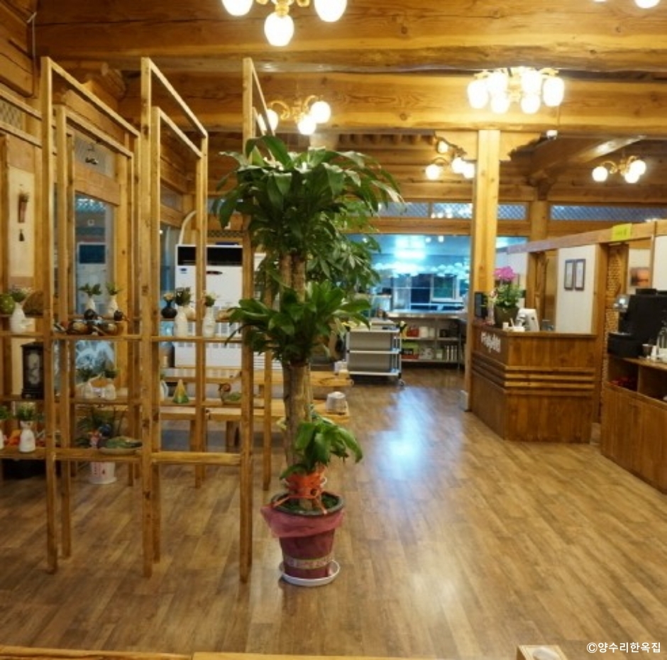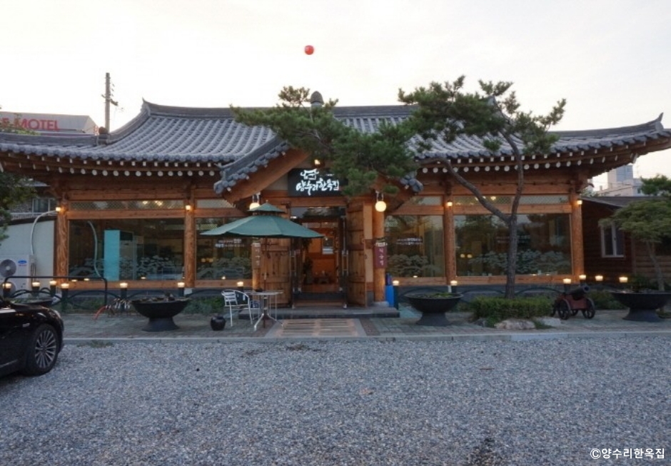 양수리한옥집은 양평군 양서면에 한옥으로 지은 해물찜, 아귀찜 전문 식당이다. 해물찜이나 아귀찜 모두 콩나물과 함께 싱싱한 아귀나 해물을 튼실하게 넣어 주며 맵기도 적당하다. 밑반찬은 단출한 편이지만 메인 메뉴는 푸짐하게 나오며 매운맛을 순화시켜주는 구수한 국물의 들깨 칼국수를 곁들임으로 제공한다. 아귀찜이나 해물찜을 먹고 남은 양념에 볶음밥을 만들어 먹는 것도 별미다. 남은 음식은 포장해 갈 수 있다. 주변에 두물머리, 세미원, 황순원 소나기 마을, 정약용 다산 유적지 등이 있어 식사 전후로 둘러볼 곳이 많다. 매장도 크고, 주차장도 널찍해서 이용이 편리하다.