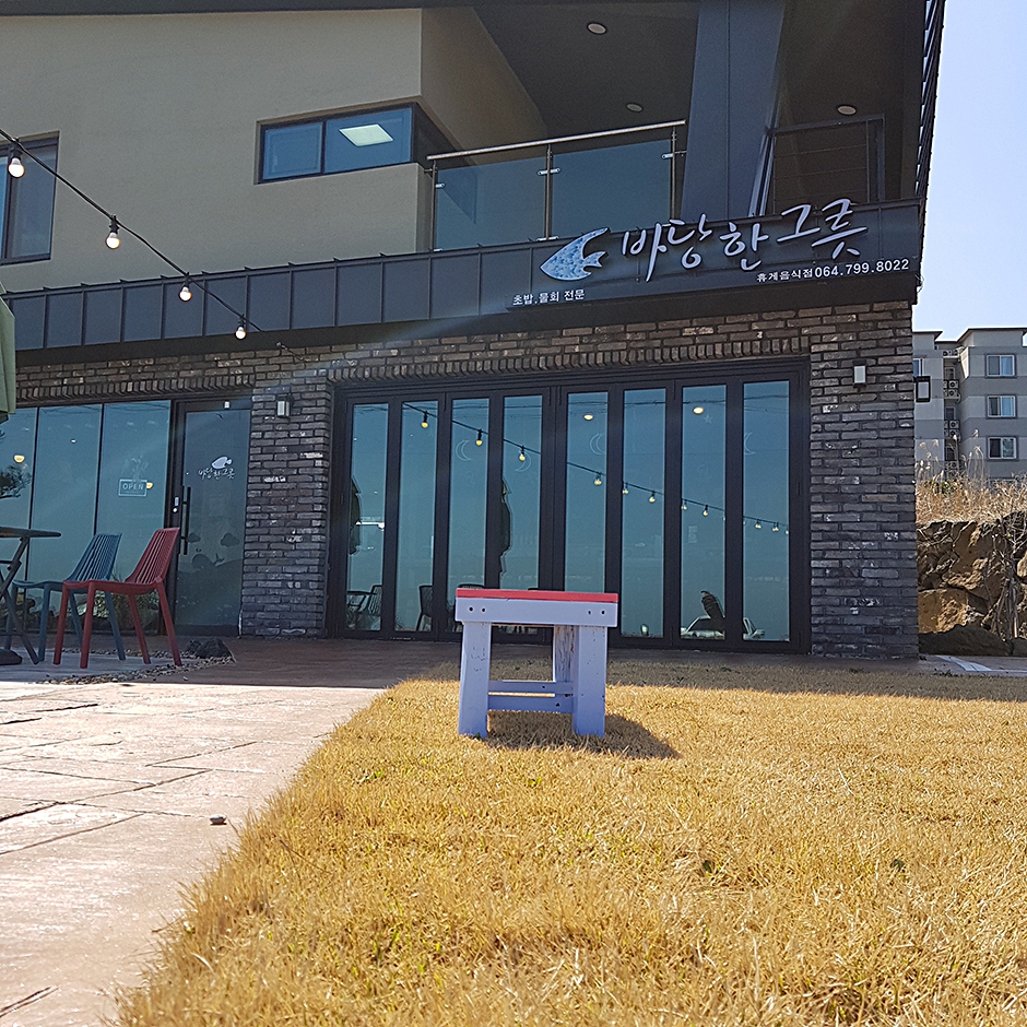 바당한그릇은 애월해안도로를 달리다 만나는 애월 돌고래전망대 인근에 위치한 해산물 요리 전문점이다. 애월해안로에 위치해 있어 전망 좋으며, 바다를 보며 해산물 요리를 맛볼 수 있다. 수족관이 있어서 싱싱한 활어와 전복, 해물을 관리하며, 제주도 특산물과 제주도 채소를 사용하여 음식을 만든다. 바당한그릇의 대표메뉴는 제철활어와 활전복, 돌문어, 딱새우가 있는 바당 특 물회이다. 제주해녀가 잡은 제주성게와 톳이 들어간 미역국도 인기가 많으며, 성게비빔밥도 맛있다. 또, 사시미해물모둠과 특물회, 새우튀김을 먹을 수 있는 세트와 매콤한 제주해물볶음과 특물회, 새우튀김을 먹을 수 있는 세트 메뉴도 준비되어 있어 든든한 한끼 식사가 가능하다.