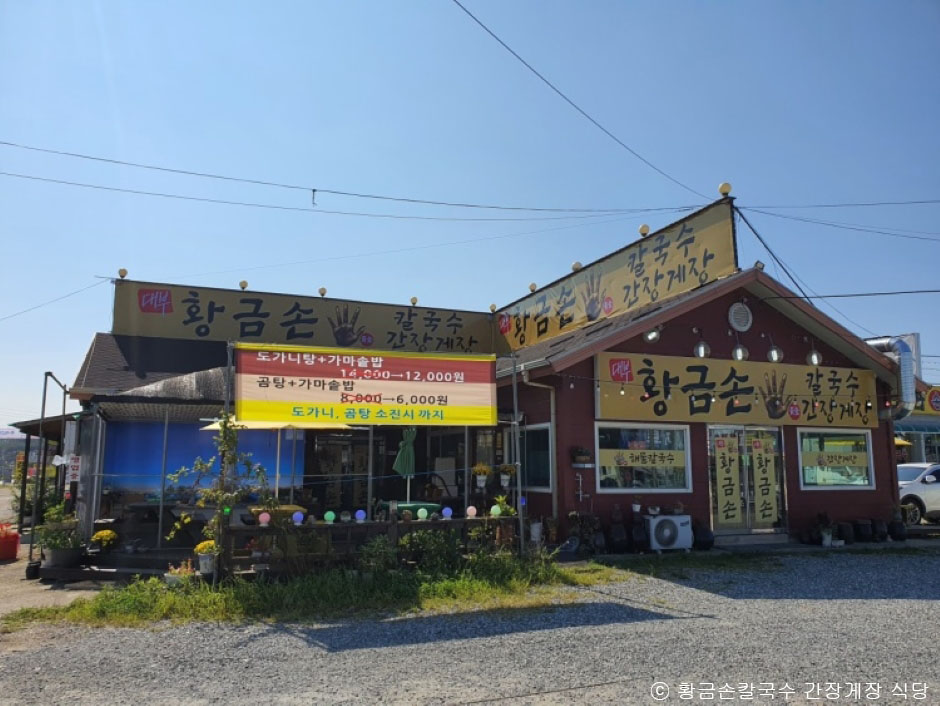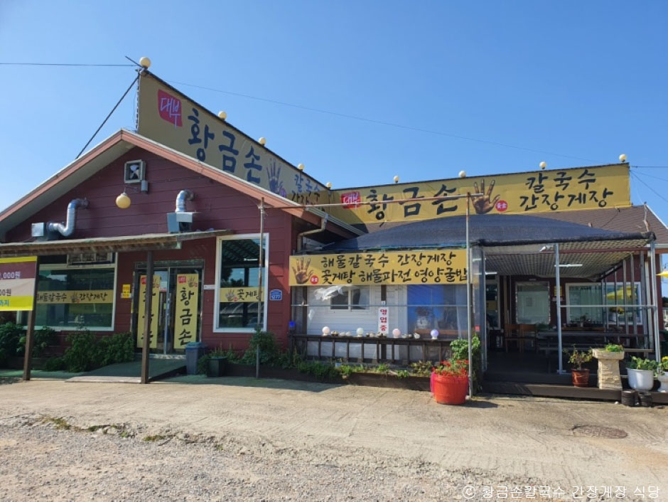 황금 손칼국수 간장게장은 경기도 안산시 대부도에 위치한 음식점으로, 칼국수와 간장게장을 판매한다. 대표 메뉴는 간장게장이 있는 게장정식 꽃게삼형제와 황금 손칼국수이며, 이 외에도 다양한 해산물을 메인으로 한 정식들과 단품 메뉴를 판매하고 있다. 직접 공수해온 신선한 해산물로 조리해 싱싱한 맛을 느낄 수 있다. 야외와 실내공간이 있어 원하는 곳에서 식사를 할 수 있다.