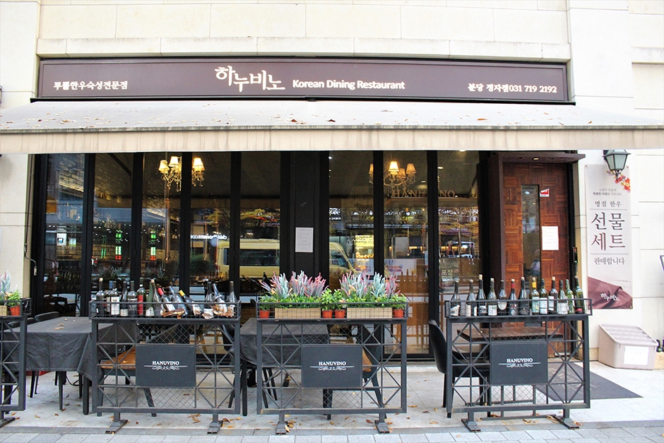 하누비노 정자점은 경기도 성남시 분당구에 있는 소고기구이 전문점이다. 최소 21일 이상 1.2도의 저온으로 숙성하여 완성된 최상의 한우만을 제공한다. 콜키지 프리로 부담 없이 와인을 즐길 수 있다. 한우등심 생불고기 전문점이지만, 외관과 내부는 고급스럽게 꾸몄다. 분위기가 좋아 기념일에 방문하기 좋다. 한우 샤브샤브, 차돌볶음과 된장찌개, 유자육회비빔밥, 유자소고기비빔밥, 한우국밥, 냉모밀, 비빔모밀, 특안심, 채끝등심, 특등심, 하누스페셜, 치마살, 살치살, 구워 먹는 임실치즈, 한우육사시미, 차돌스페셜, 한우 육회, 차돌깍두기볶음밥, 한우된장말이, 화산 계란찜 등 여러 가지 메뉴를 맛볼 수 있다.