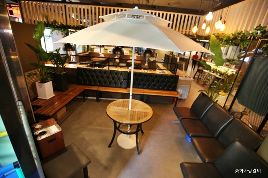 화사랑 갈비는 7호선 신중동역 롯데백화점 뒤에 있는 숯불갈비 전문점이다. 깔끔하고 넓은 내부에는 곳곳에 식물들을 배치해 놓았고 테이블도 여유롭게 배치되어 있다. 또한 각종 모임을 할 수 있는 단체석과 룸이 있고 아기 동반 손님을 위한 유아 전용 의자와 어린이 놀이방이 있다. 셀프 바가 있어 정갈하고 깔끔한 밑반찬과 채소들은 언제든 리필할 수 있다. 특히 이곳엔 계란프라이를 직접 만들 수 있는 팬과 버너, 계란이 한쪽에 마련되어 있다. 돼지갈비가 대표메뉴이며, 이 외에 생삼겹살, 소 생갈비, 한우육회 등 다양한 메뉴를 맛볼 수 있다.