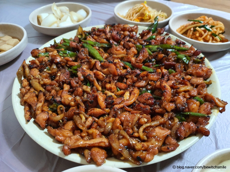 청송의 달기 약수는 400년의 역사를 가진 알칼리성으로 위장, 신경, 빈혈 등에 좋기로 소문난 약수이다. 일제강점기 때 약수를 먹기 위해 천막을 친 사람들에게 숙식을 제공하면서 생긴 것이 약수 식당이다. 처음 집을 지으면서 심은 마당 한가운데 등나무가 30년이 넘은 전통 있는 업소이다. 대물림을 하고 있는 주인장의 대표적인 상차림은 약수로 고아 내는 토종닭이다. 달기 약수에 토종닭과 황기, 인삼, 시오, 감초와 같은 한약재와 마늘, 대추, 녹두, 찹쌀 등을 넣어 푹 고아 낸 백숙은 쫀득쫀득하면서 구수한 맛으로 육질이 풀어지지 않고 국물이 아주 맑은 것이 남다르다. 백숙을 전부 건져 먹은 다음 닭죽이 나오는데 이 또한 별미이다. 밑반찬도 넉넉한데 모두가 유별난 맛이다. 배추 물김치, 무지, 가죽나물지가 별미이다.